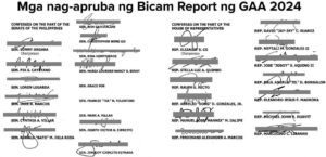 Kaugnay ng bicam report ng 2023, narito ang mga pumirma mula sa House at Senate panels. Sa ratification ng bicam report noong December 11, 2023, tanging ang 3 kinatawan ng Makabayan ang bumoto ng NO sa House, at tanging si Sen. Koko Pimental ang bumoto ng NO sa Senate.